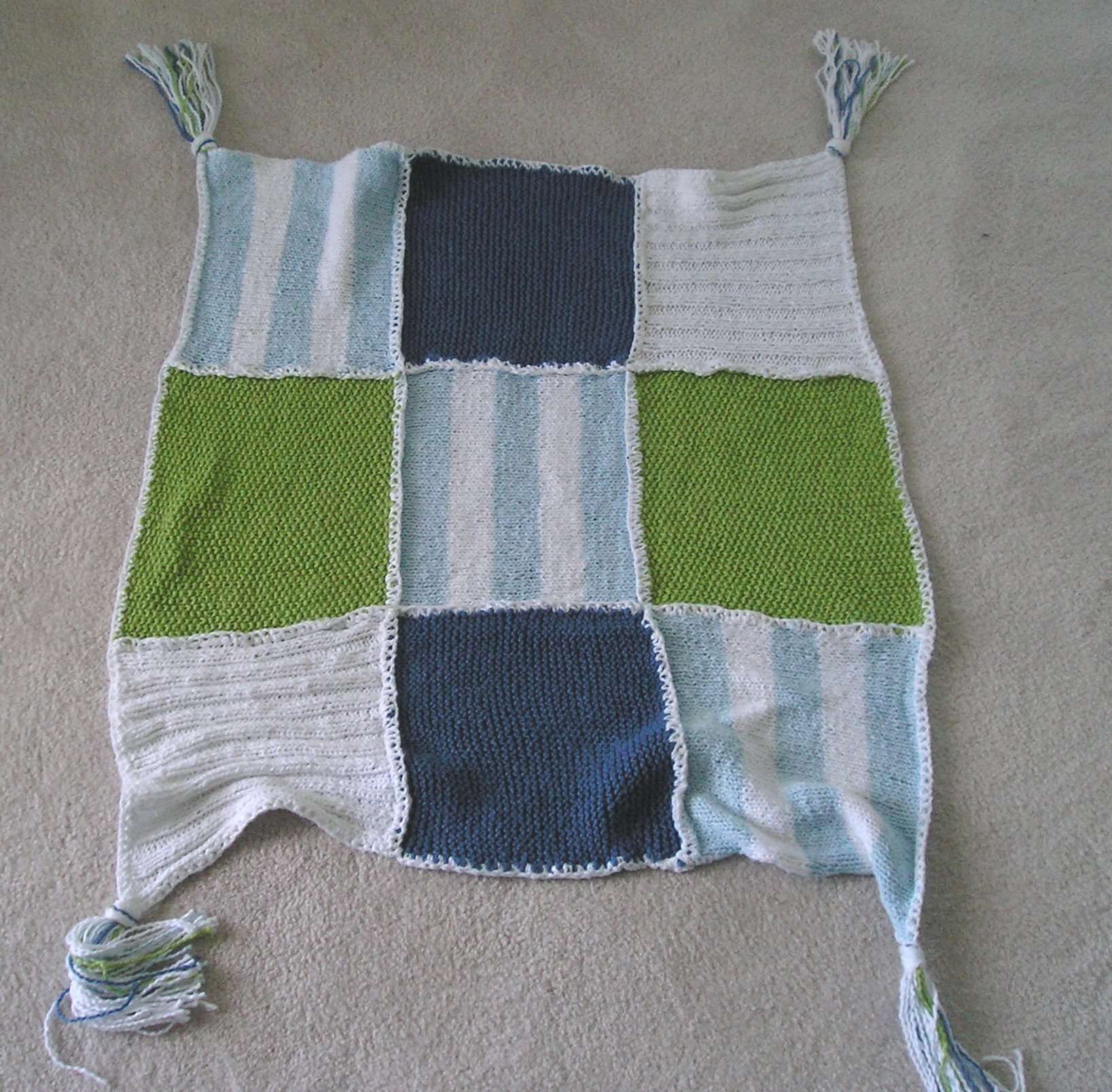 The pattern is from Suss Cousins Hollywood Knits Style and is called, appropriately enough, “Baby’s First Blanket.” Instead of the neutrals called for in the pattern, I chose Suss Cotton in White, Spa Blue (darker), Sky Blue (lighter), and Honeydew. Each of the nine patches is done separately and grafted together with single crochet at the end. I love the way this looks, even though my crochet skills could still use a lot of work.