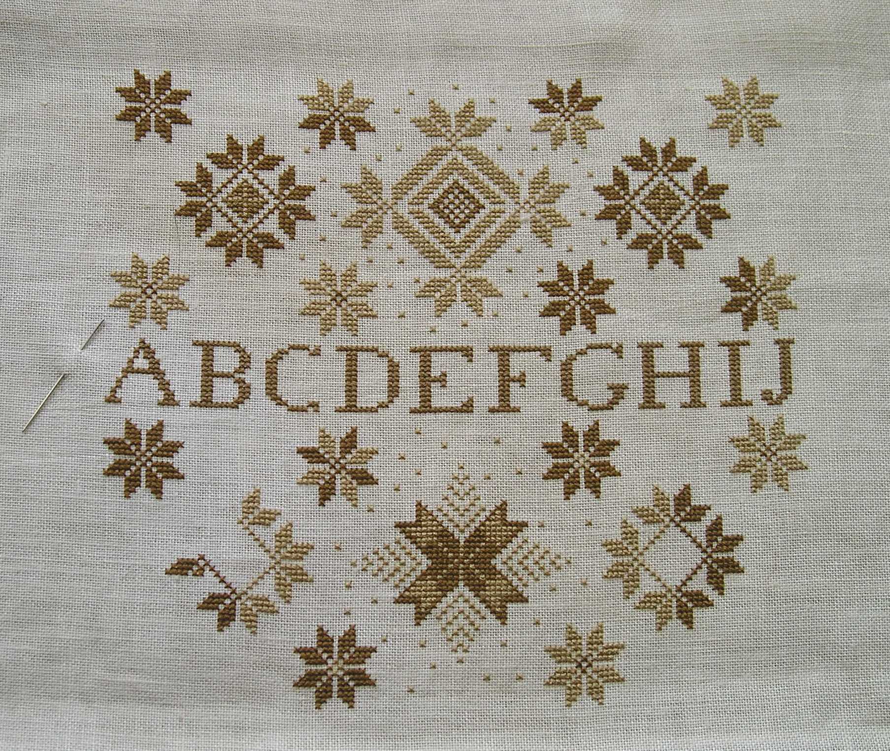 This is the third or fourth time I’ve worked with Splendor silks by Rainbow Gallery (colors: S1038, S1039, and S1040). I’m using the lightest brown and darkest brown for the geometric motifs and the medium (S1039) for the lettering of the alphabet. So far I give them a positive review. The strands divide easily, but not too easily, and even though silk can be notoriously fragile, these strands hold up very well in spite of the fact that I like to use relatively long lengths of floss while stitching. To me, time spent rethreading the needle is time lost.