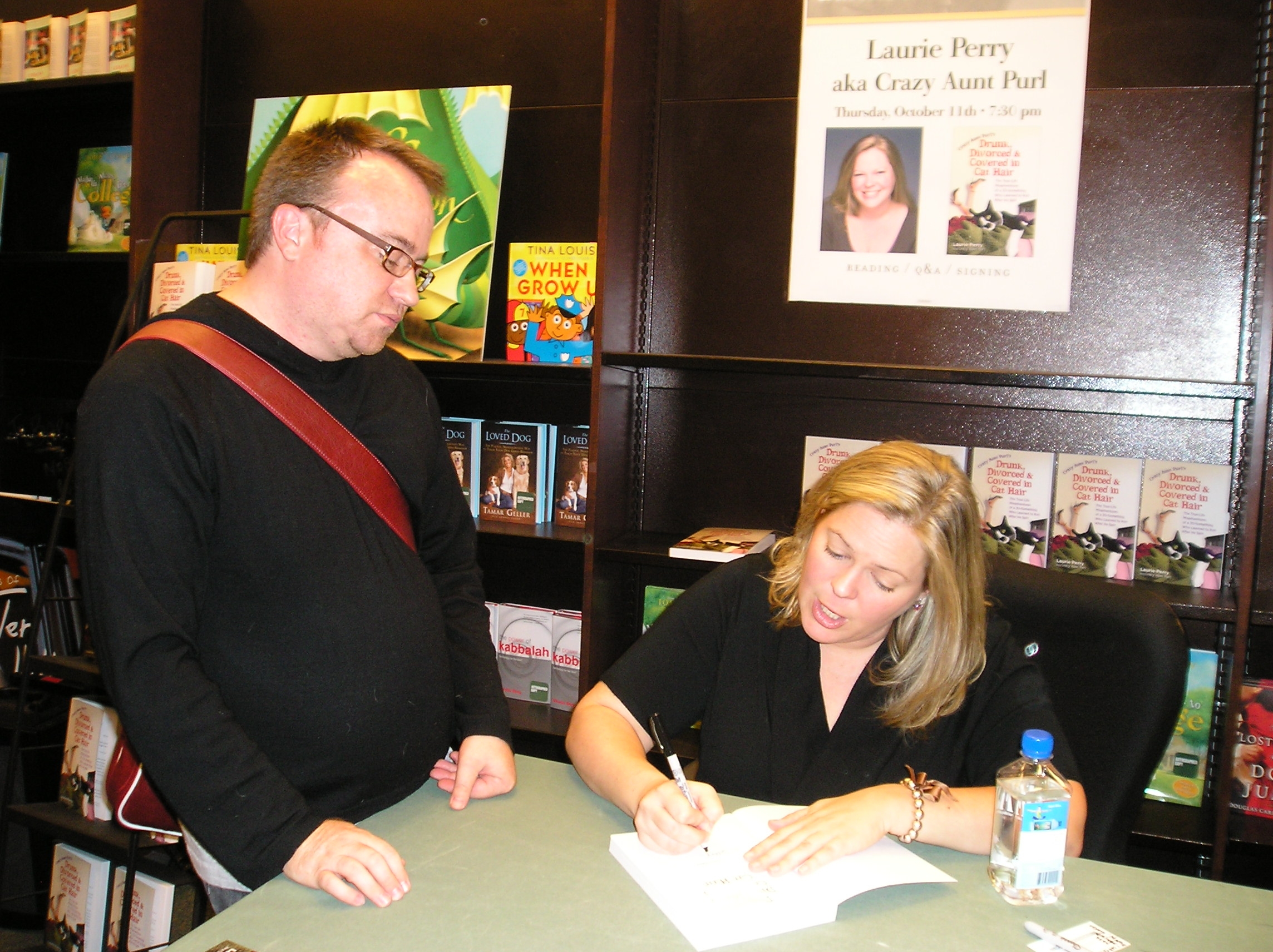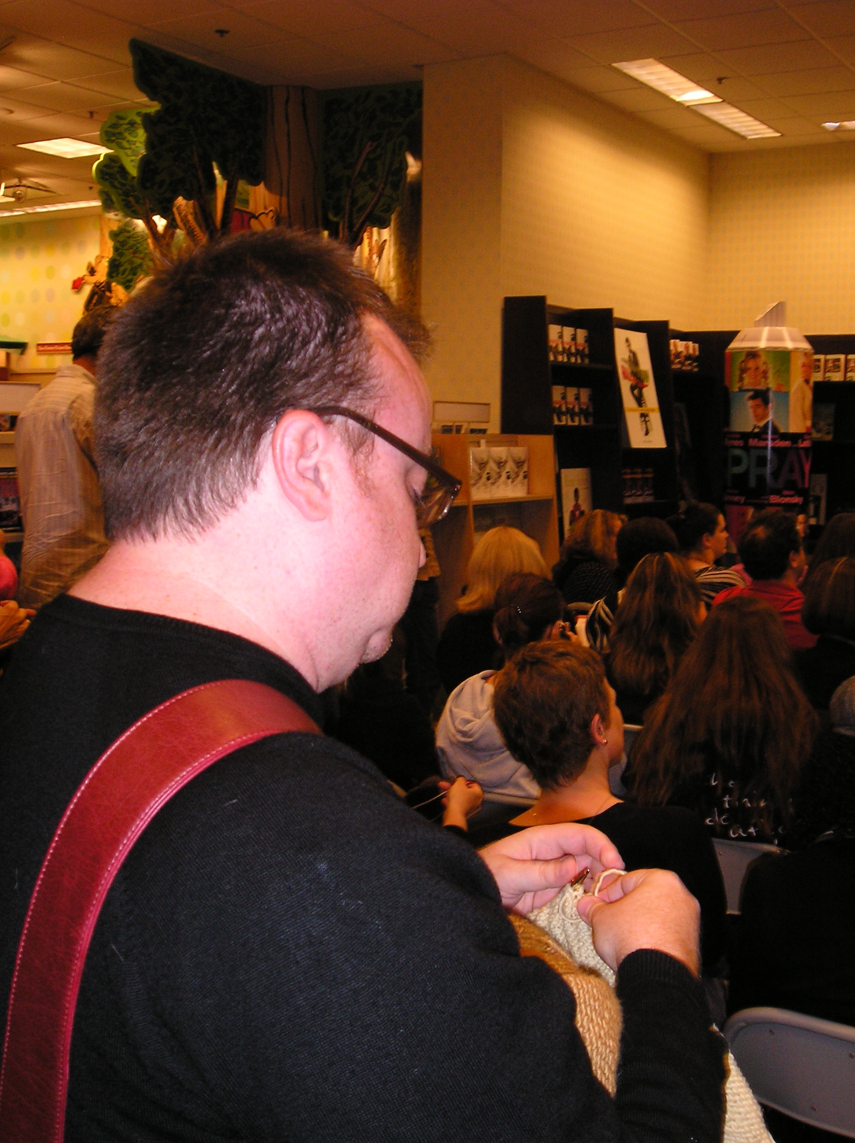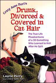 Drunk, Divorced and Covered in Cat HairLast night, I went with my friend Jeffrey of Knitting Sinister to a book-signing event at Barnes & Noble for Crazy Aunt Purl‘s Drunk, Divorced & Covered in Cat Hair: The True Life Misadventures of a 30-Something Who Learned to Knit After He Split. I tell you, it was the knitting event of the season–anyone who was anyone in the world of Los Angeles Stitch n Bitch (are we still allowed to use that phrase?) was there, including Faith Landsman of That is so Queer and Ellen Bloom of L.A. is my Beat. Both are featured as “characters” in the book as well. In fact, Laurie Perry, a.k.a. Crazy Aunt Purl credits them both with introducing her to the wonderful world of knitting.