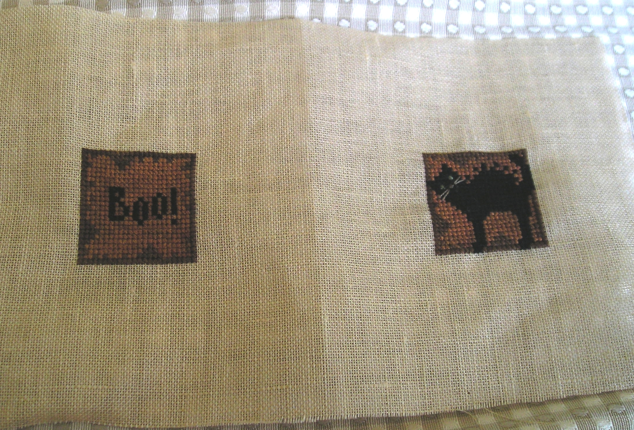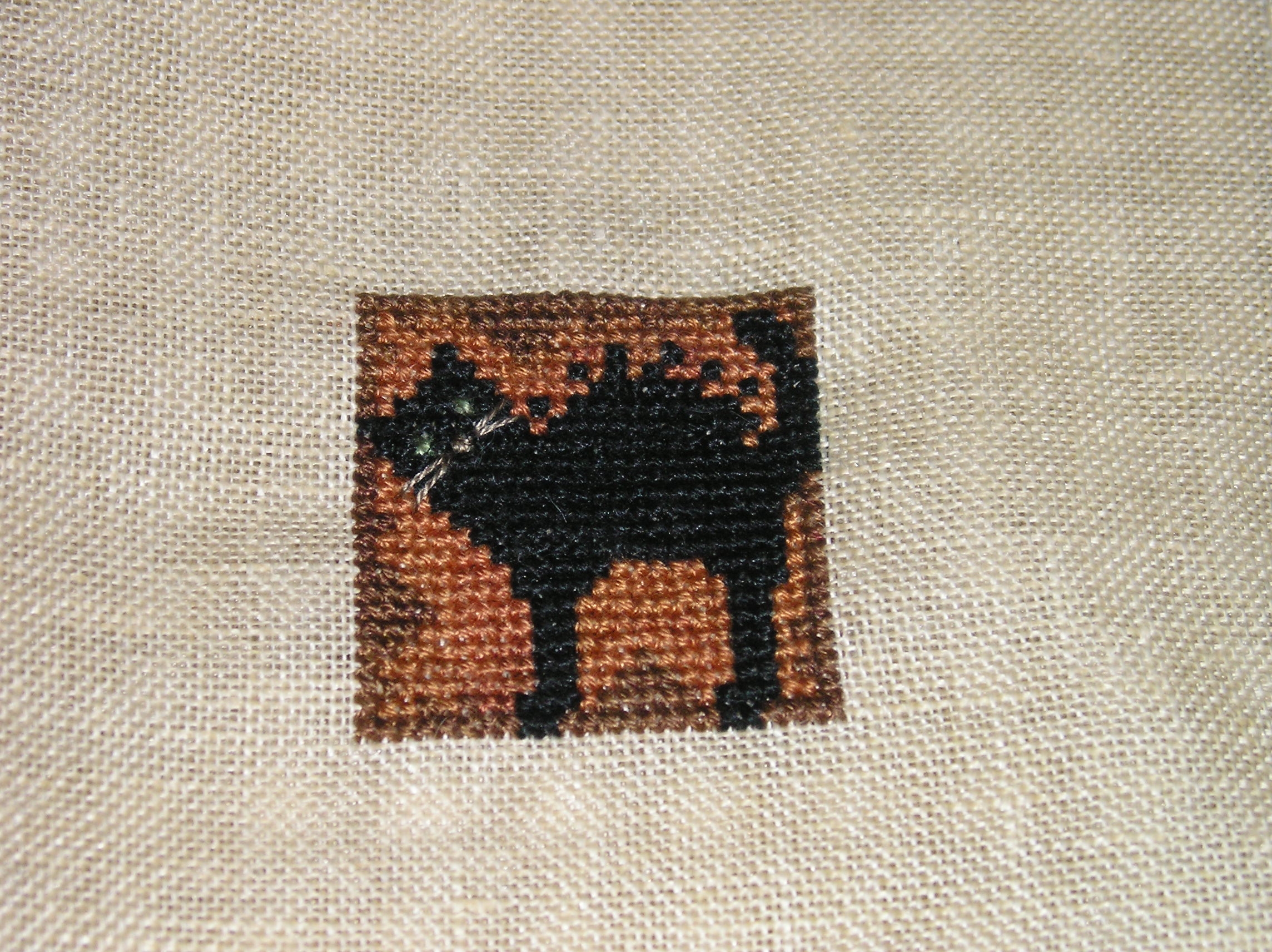 In celebration of Halloween, I’ve worked up this little design from Bent Creek, “Black Kitty” on 40-count sand linen with two strands of floss over two. I like the nice, thick effect this “overuse” of floss creates.