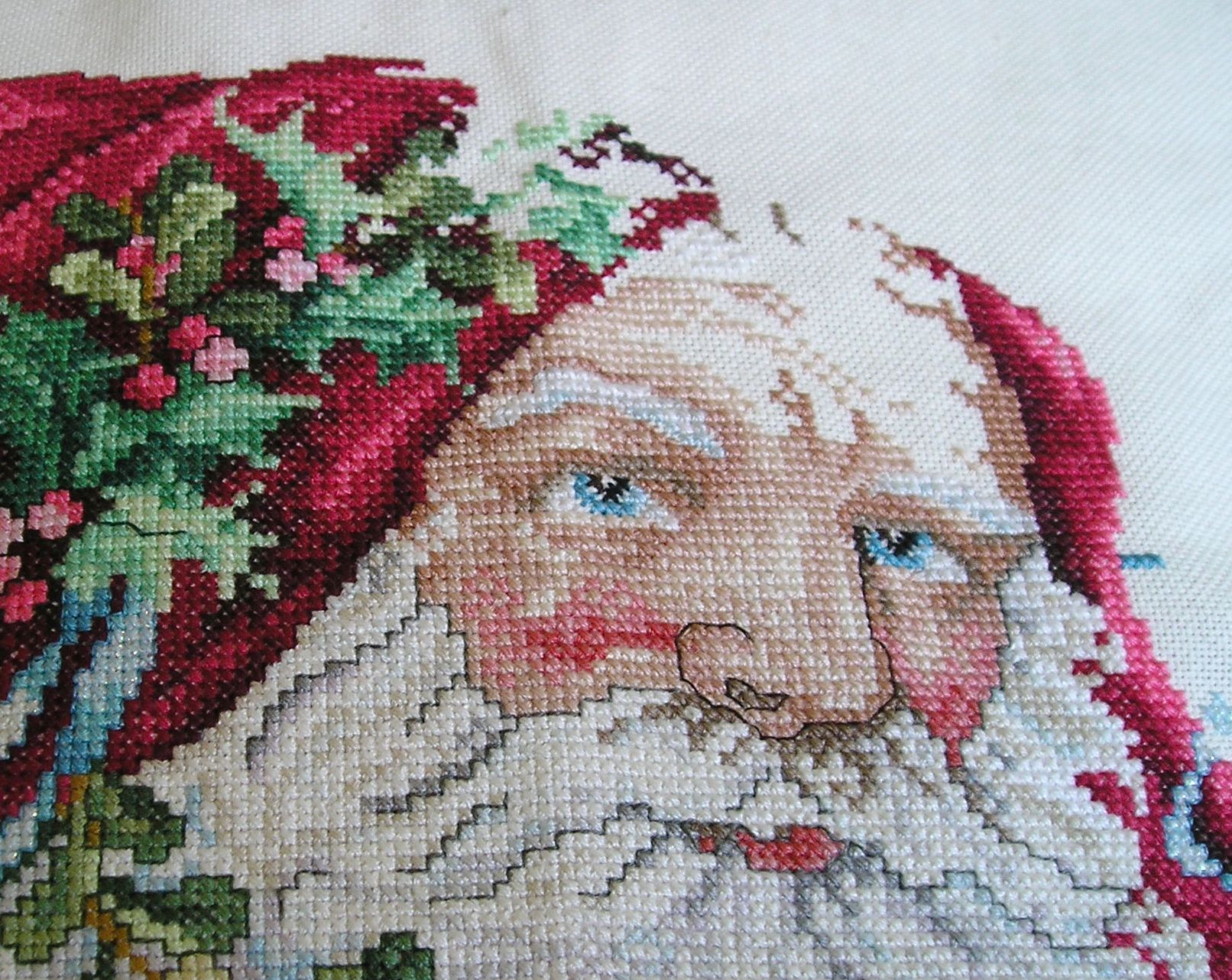 Here’s a close-up of the upper right (Santa’s forehead and wreath) so you can really see the progress: