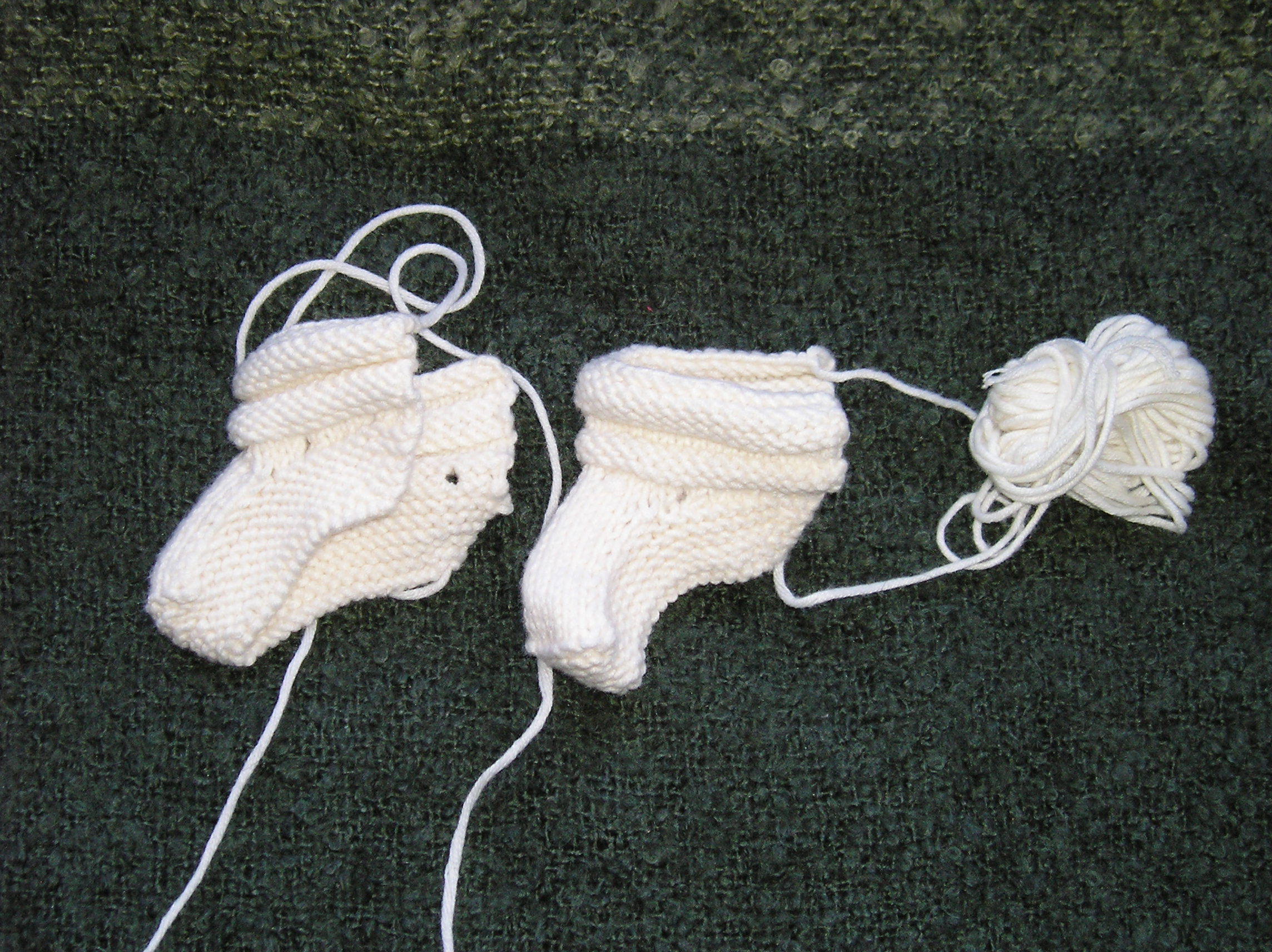 After about a million abortive starts, I finished one of the Newborn Set booties yesterday, and I finished the second today. It’s hard to believe actual human feet could ever fit in these.
