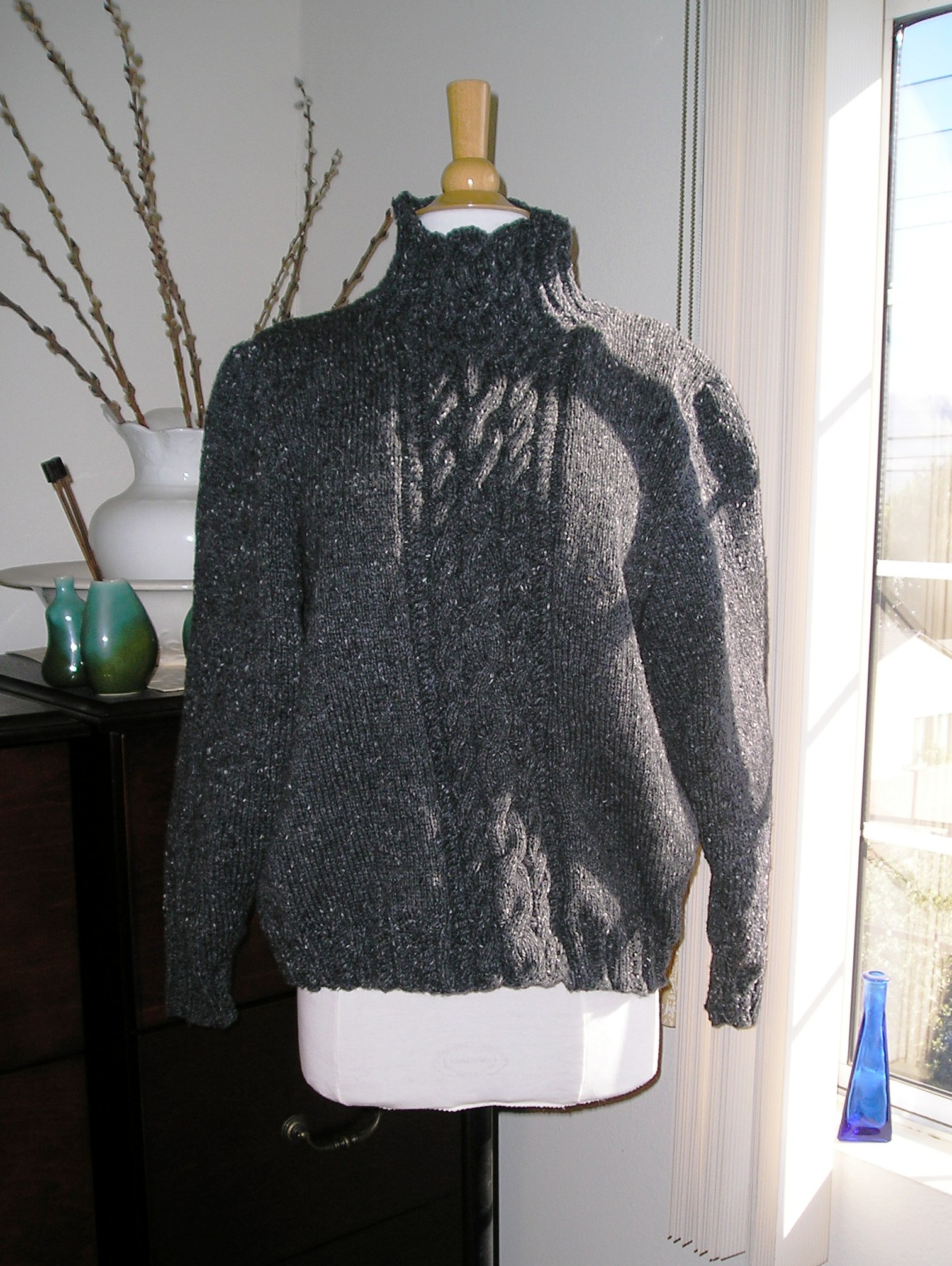 Karen's Cable SweaterIt’s hard for me to believe, but I’ve finally finished the Cable Sweater for my SIL, Karen. This sweater started as a Christmas present for 2006, so you can get an idea of what a saga it’s been. Obviously, I didn’t get it finished for Christmas 2006, or her birthday in February 2007 (that was plan B), or Christmas 2007, or her recent February 2008 birthday (Plan Z?). Fortunately, although she’s notoriously difficult to shop for, she’s a very understanding and patient gal who doesn’t hold it against you if you’re late–very late–with gifts.