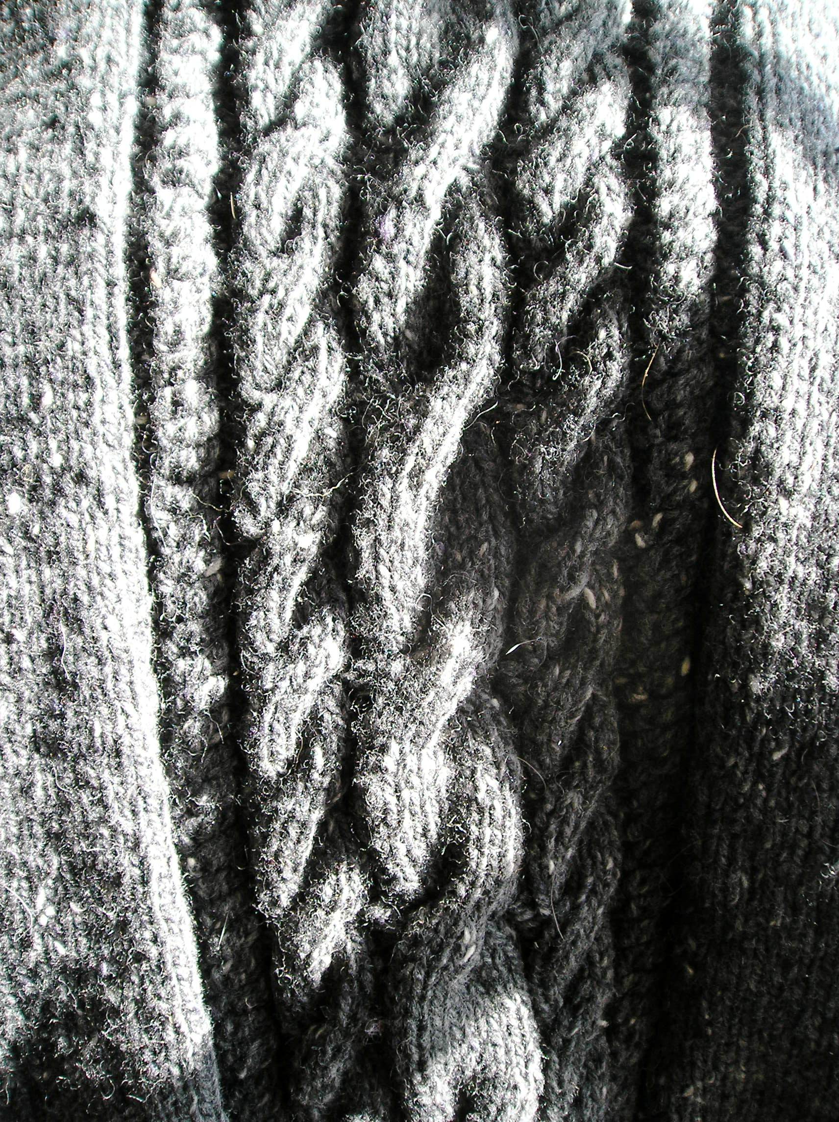 And, with this sweater, I think I’ve found the perfect present. She almost always wears dark grays and blacks, so I chose this great Rowan Yorkshire Tweed DK (color #354, “Gust”), a dark speckled, tweedy charcoal gray. When I began this sweater, they had just discontinued Yorkshire Tweed so I almost felt like I was racing the clock trying to get this sweater done before it became completely impossible to obtain any more balls.