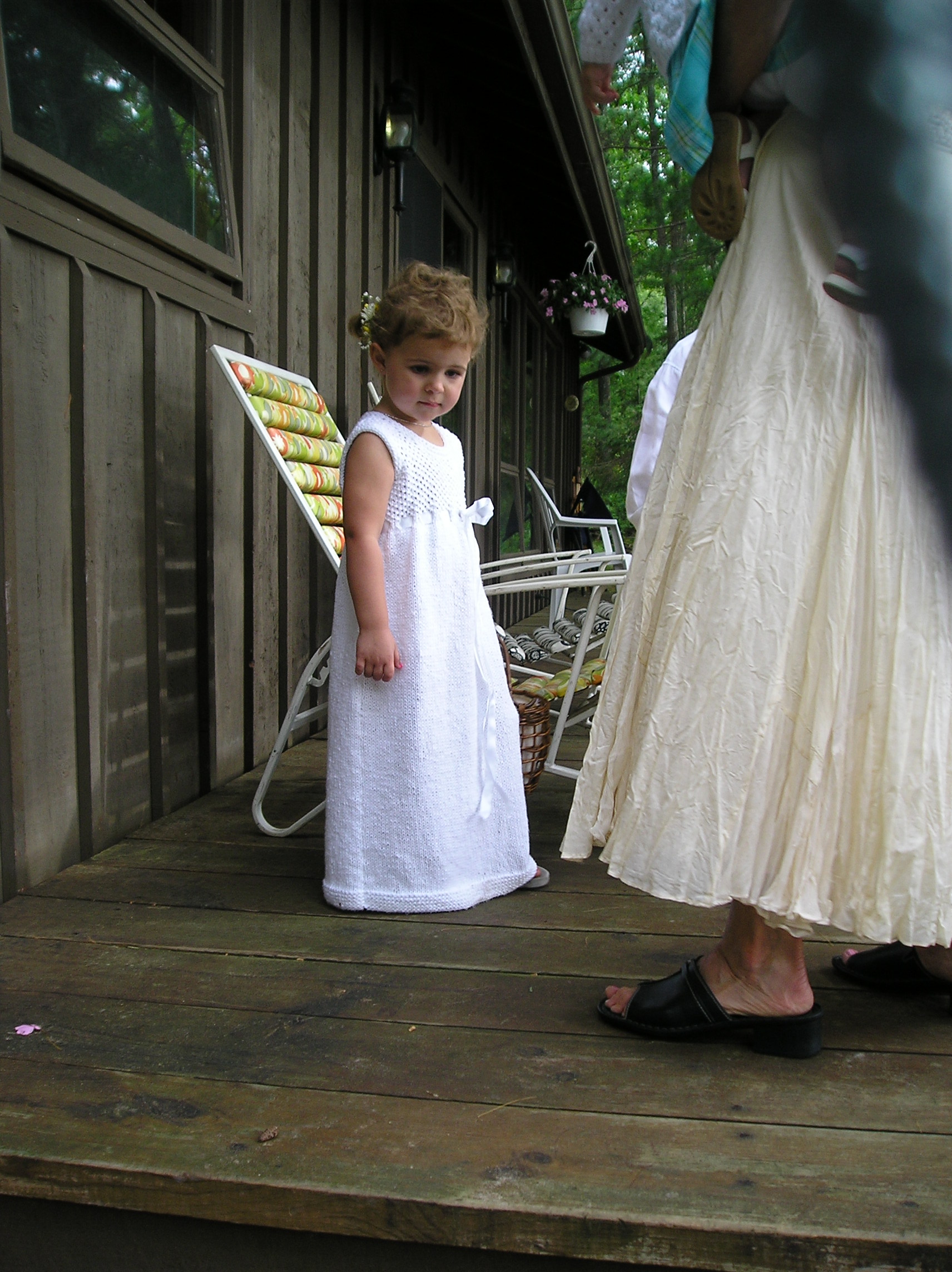 I went to a family wedding in northern Wisconsin this past weekend and had an amazing time in a beautiful location. Since this isn’t a blog about my family, I’ll spare you all the details, but I did want to share this photo with you. This is the flower girl, my cousin Hudson, in her adorable dress, hand-knit by my Aunt Kathy, a woman who’s been at this knitting game for longer than I’ve been alive. I don’t know what pattern she used, but when I find out, I’ll let you know. What a great gift for the couple!