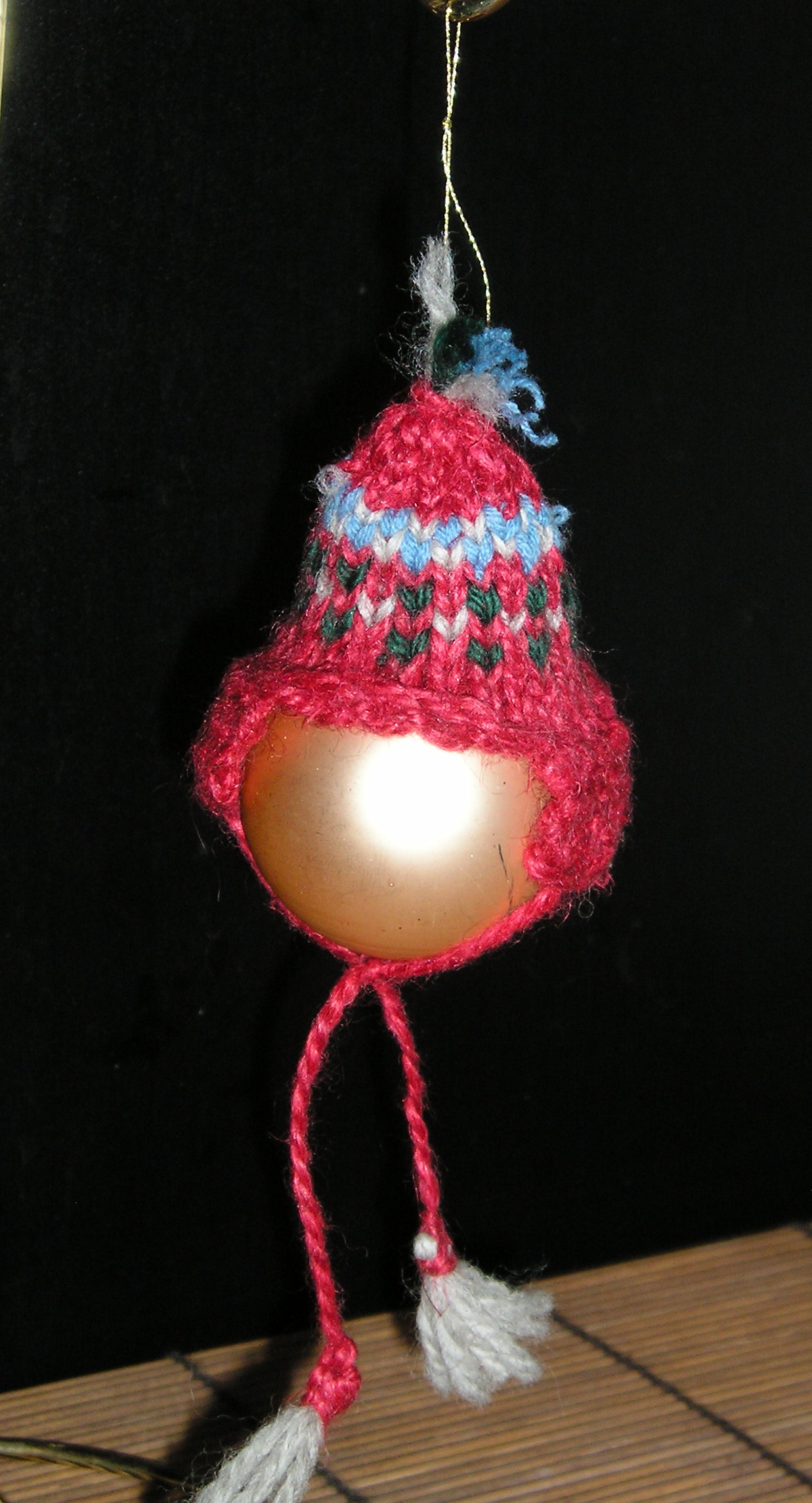 Chullo Christmas OrnamentYou are doing gauge swatches, aren’t you? OK, OK… Christmas is no time for nagging, especially not when you’ve got multicolored yarn-covered Christmas ball ornaments to wrap. To the left is my absolute favorite, a gold ornament wearing a chullo hat–with a fair isle design no less! Chullos are originally from the Andes Mountain region of South America, especially Peru and Bolivia, but they’re starting to become very fashionable here in the United States as well. If you’re interested in styles from this region, I highly recommend you start with Marcia Lewandowski’s Andean Folk Knits: Great Designs from Peru, Chile, Argentina, Ecuador & Bolivia.