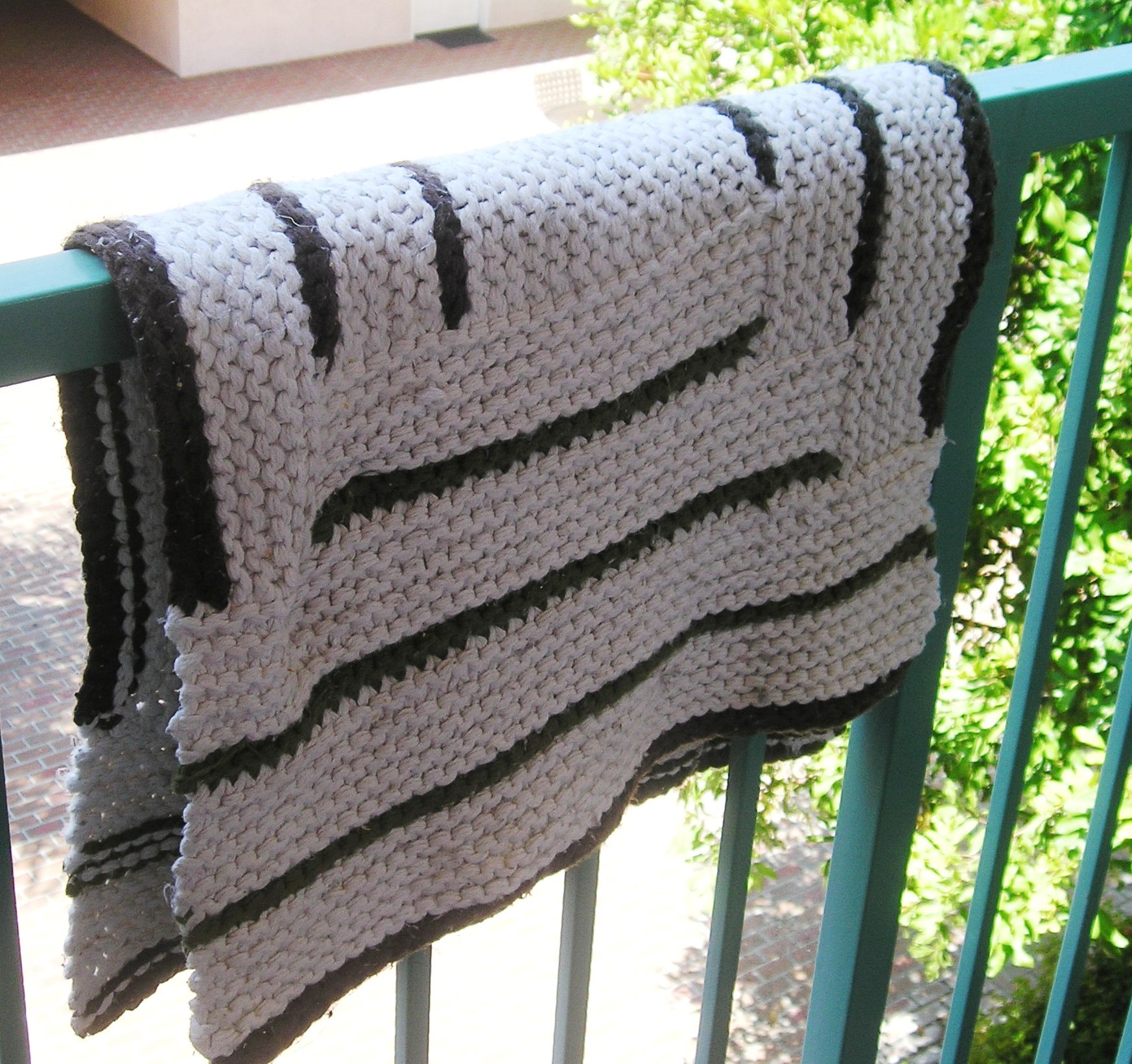 For this project, I used size 15 needles and four strands of either Lily Sugar & Cream and Suss Bomull in ivory, chocolate and olive. The two yarns are, IMHO, completely interchangeable. The olive and chocolate bands (which are a little hard to see in this photo) match the colors in my bathroom decor (and I use the term “decor” loosely). You’ll have to trust me that those colors work. Really.