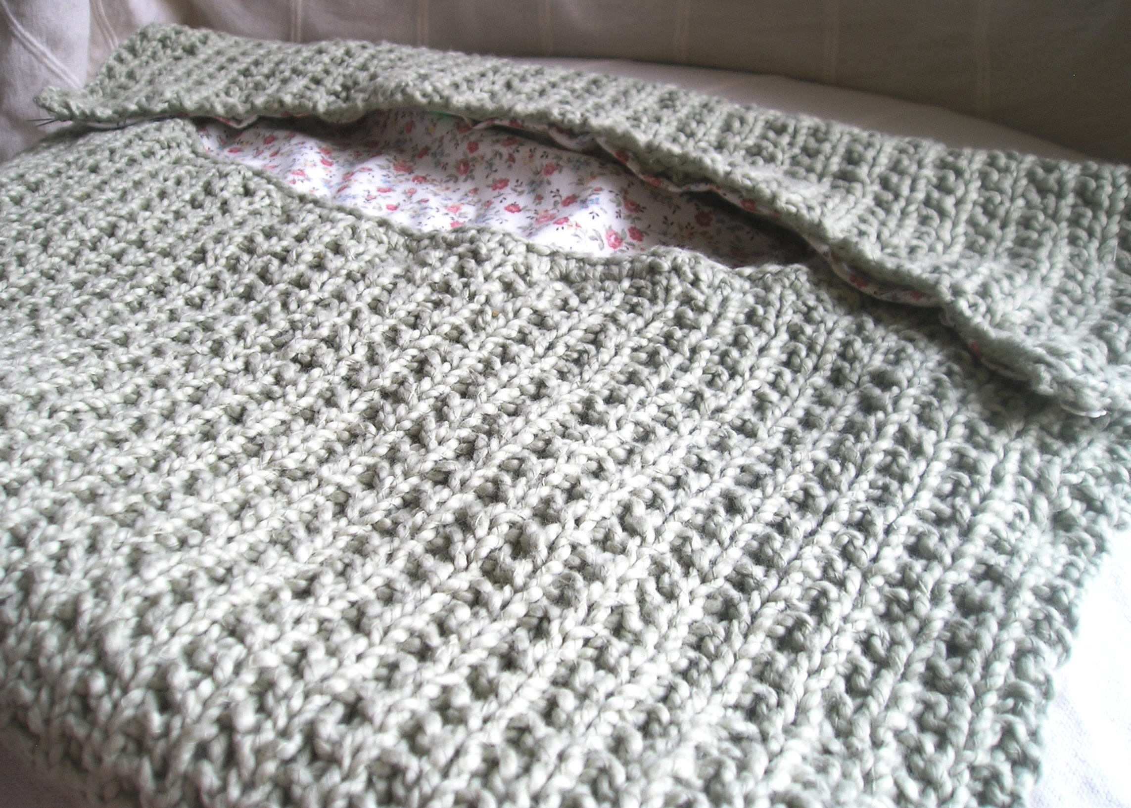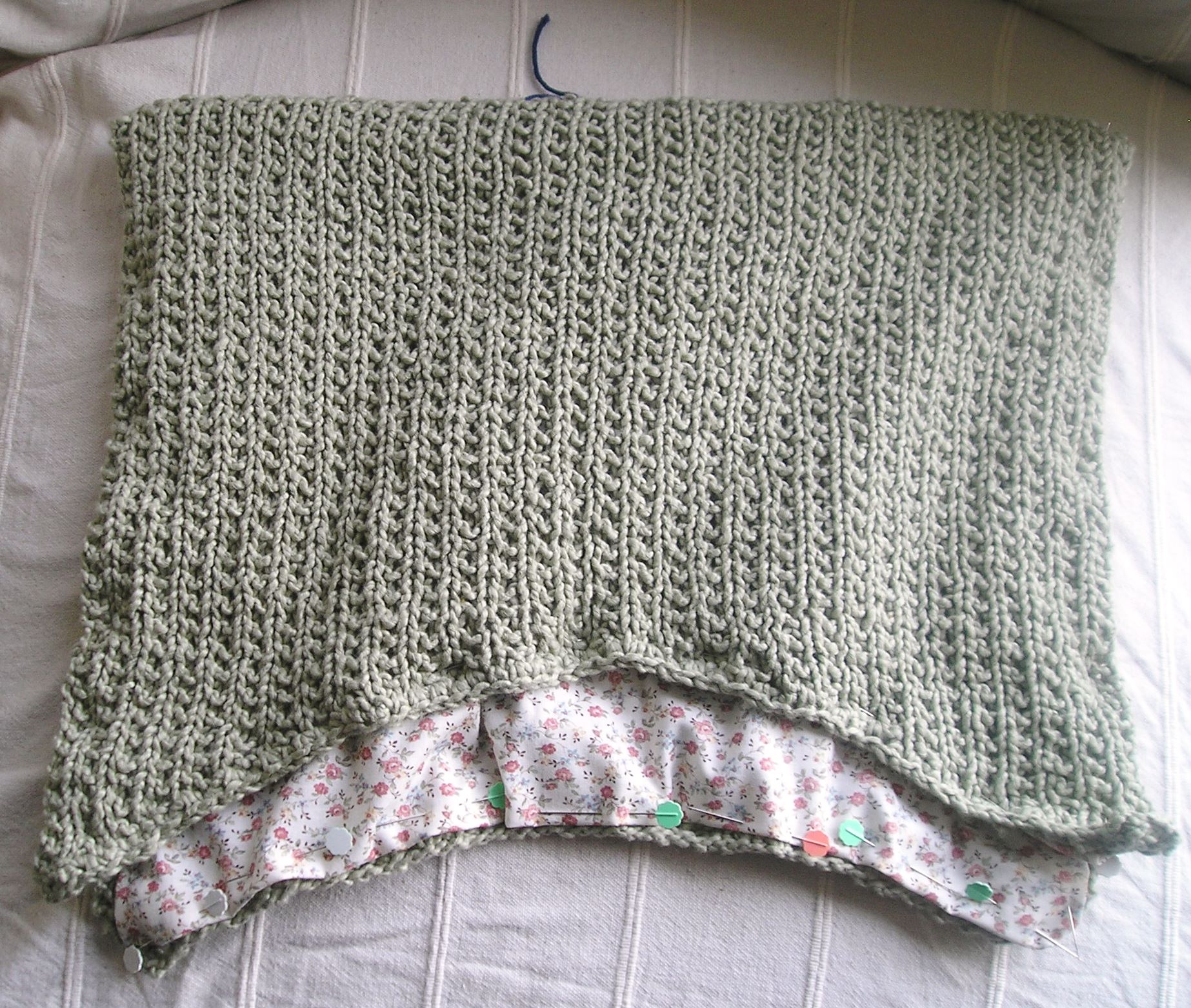 My friend Deborah, who is something of an expert seamstress, helped me with the lining and the machine sewing. I must admit, sewing machines still intimidate me a little bit. The fabric is some old calico-style print I bought on sale years ago — so long ago, in fact, that I can’t remember where or when. It matches well with the sage color of the yarn though.