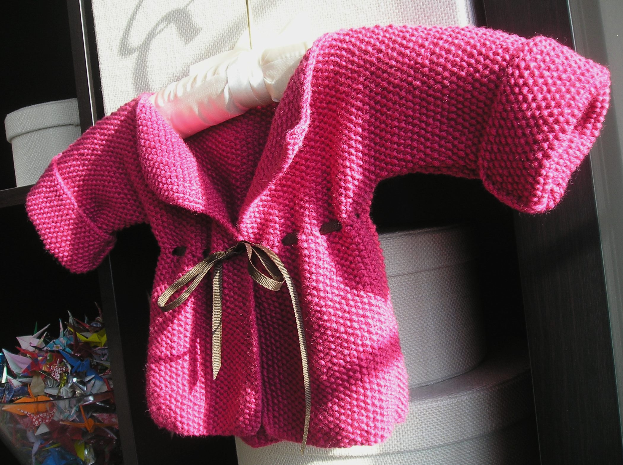 A three-needle bind-off here. A chocolate grosgrain ribbon there. A little seaming. And the Baby Cardigan is finished at last! Phew! It looks beautiful and since my little niece, Lauren Amelia, was born the week before last, I’m glad that I will have an even more beautiful baby to give it to.