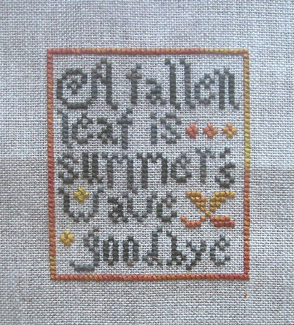 For this design, I substituted Weeks Dye Works “Bark” (lettering) and Gentle Arts Sampler Threads “Autumn Leaves” (leaves and border) for GAST “Pine Woods” and “Cinnamon” respectively. I also added another little design element in the middle of the “W” in the word “wave,” fleshed out the leaves a little bit, and changed the “a’s” to a font I liked better. To each her own…