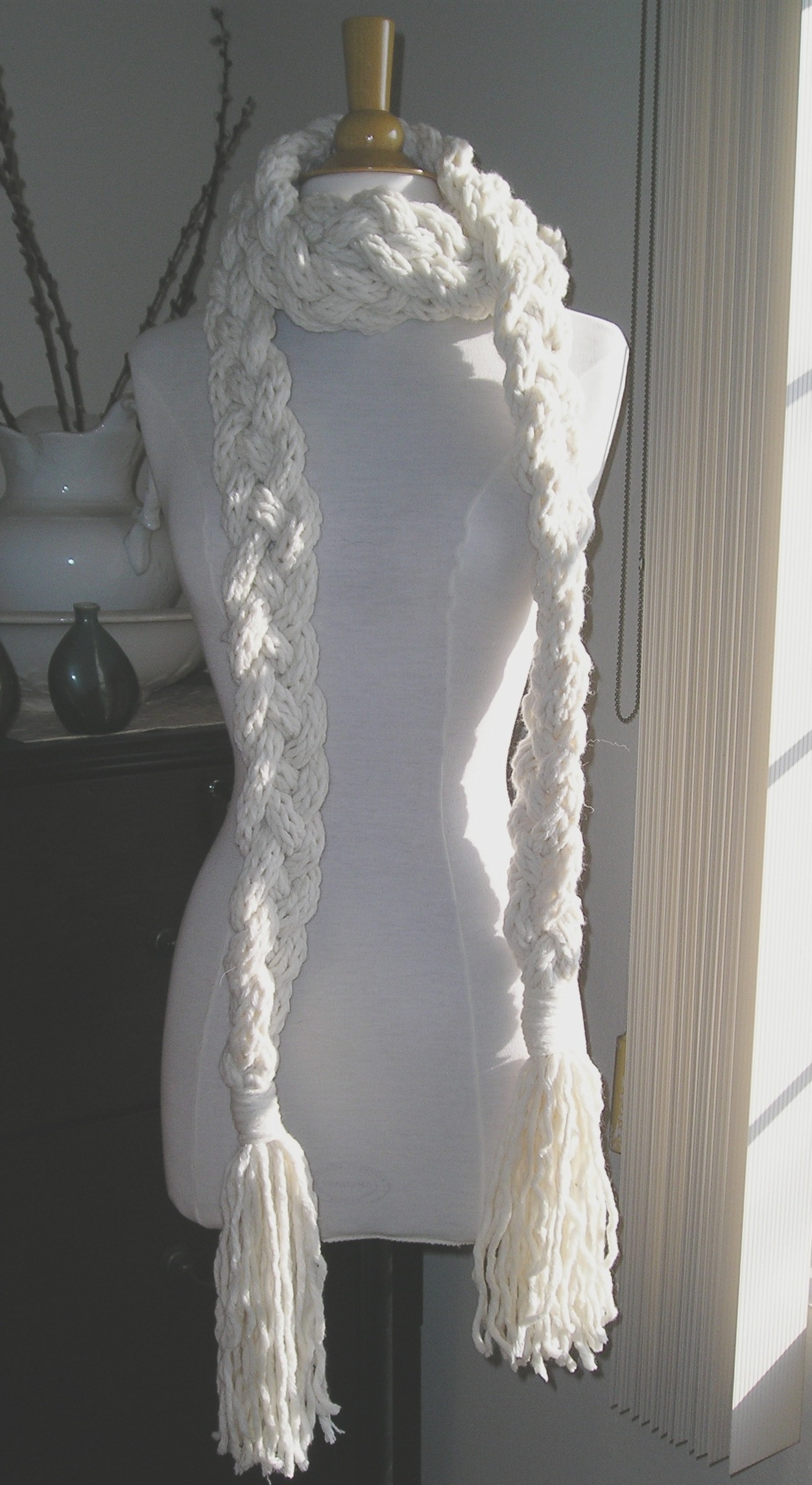 I’ve always imagined Rapunzel unfurling a long, blonde braid that looked like a magnificent, intricately woven rope. This scarf reminds me of that braid. A couple years ago, Anthropologie was selling a Rapunzel Scarf that consisted of a braided rope of various yarns (a great way to use up your stash, by the way), but I thought an I-cord version in a nice, neutral ivory would be even lovelier. I hope you enjoy it!