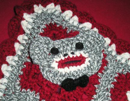 Here’s a close-up of the boy monkey face (note the bow tie). Apparently, he’s dressed for the Sock Monkey Ball (or about to get beaten up at Sock Monkey Elementary):